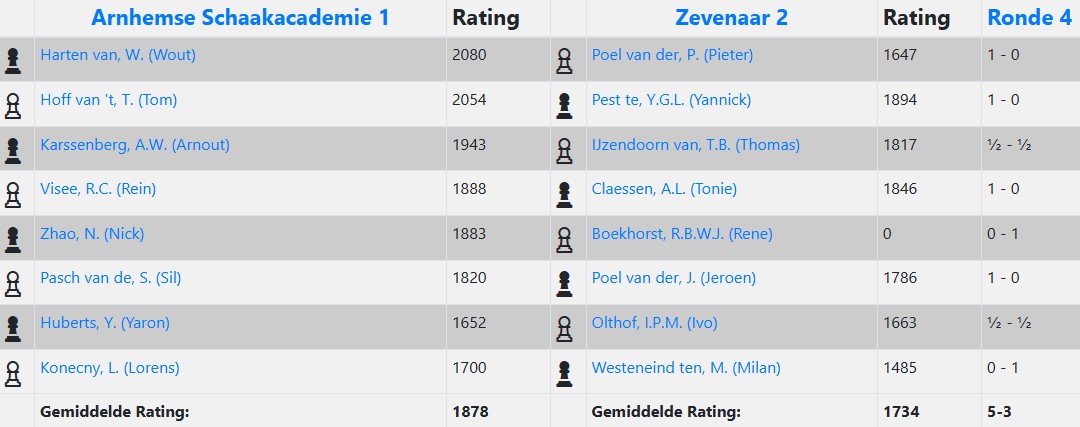 Kevin Verfürth had de hele partij een mooi initiatief met een mooi centrum en dreiging tegen de vijandelijke koning. De breekzet e5, met beiden nog een paar minuten op de klok, leek voor de beslissende doorbraak te zorgen. Kevin had waarschijnlijk moeten vervolgen met een kansrijk kwaliteitsoffer, speelde echter e6 en had niet gezien dat deze pion ook met de dame (met de toren was mat) geslagen kon worden. Door de geopende e-lijn vielen de vijandelijk torens nu beslissend binnen (1-7).